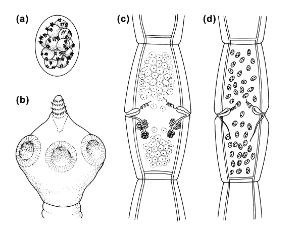 Tử cung được ghép với 16 đến 20 nhánh xuyên tâm. Các sán có thể thu vào Rostellum với bốn hàng móc, cùng với bốn mút mà tất cả các Cestodes Cyclophyllid đều có.